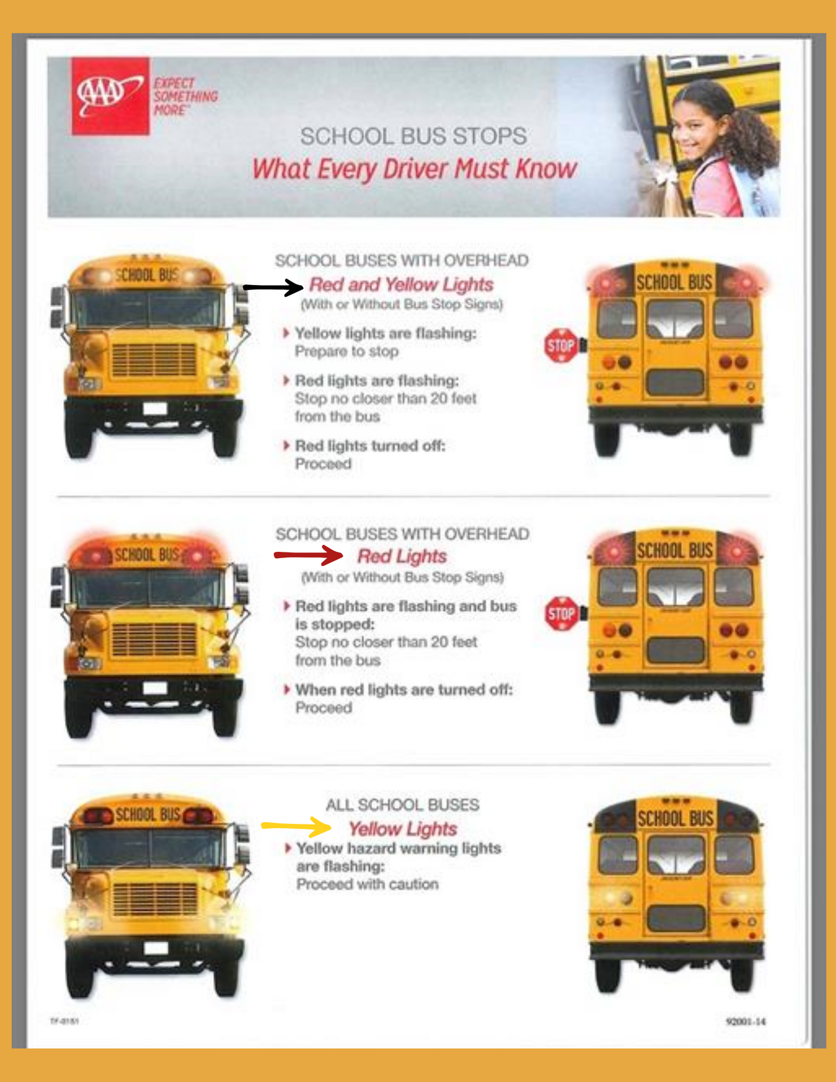 Page: School Bus Stops-What Every Driver Must Know. SCHOOL BUSES WITH OVERHEAD: Red with Red & Yellow Lights (with or without Bus Stop Signs).  1) Yellow lights are flashing: Prepare to stop. 2)Red lights at flashing: STOP no closer than 20 feet from the bus. 3) Red lights turn off: proceed.