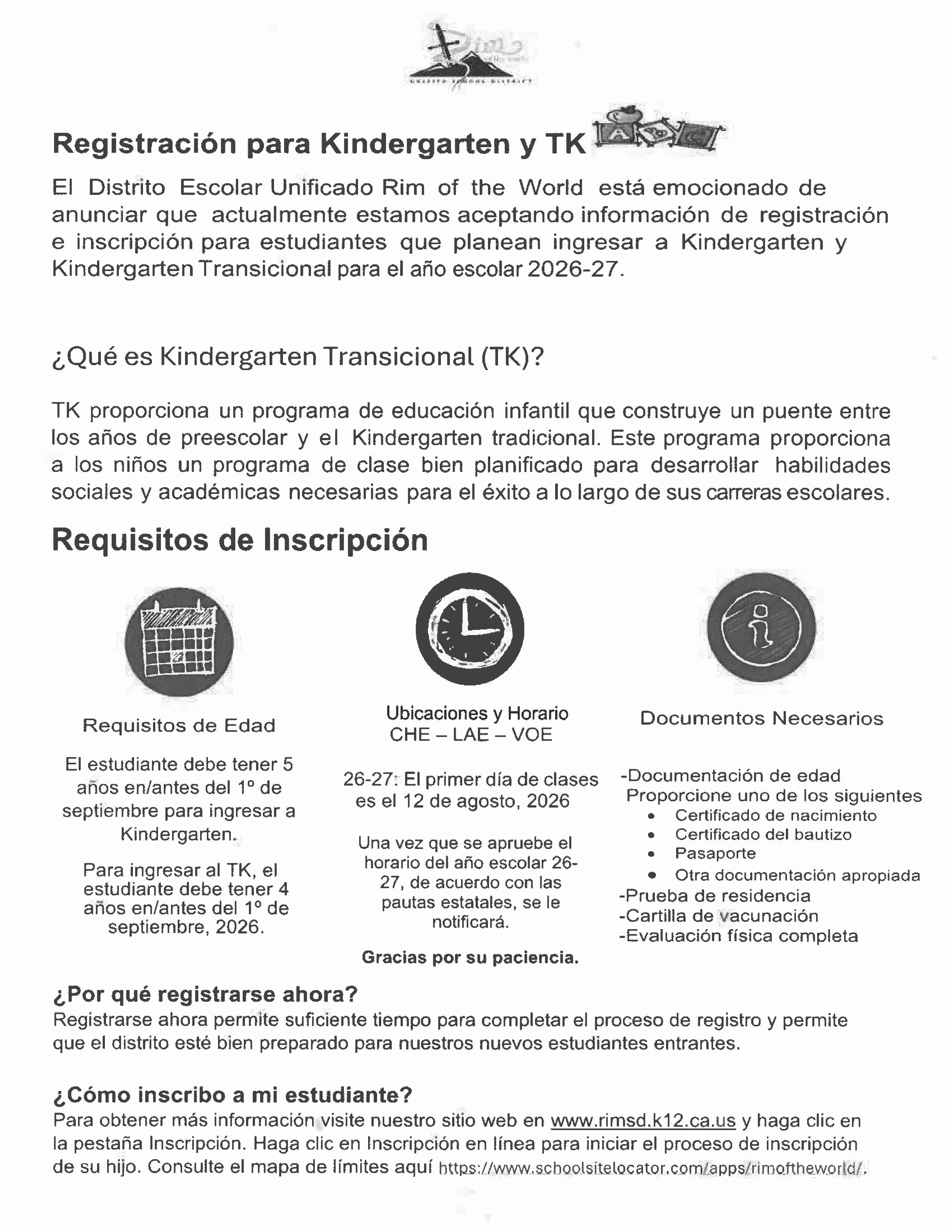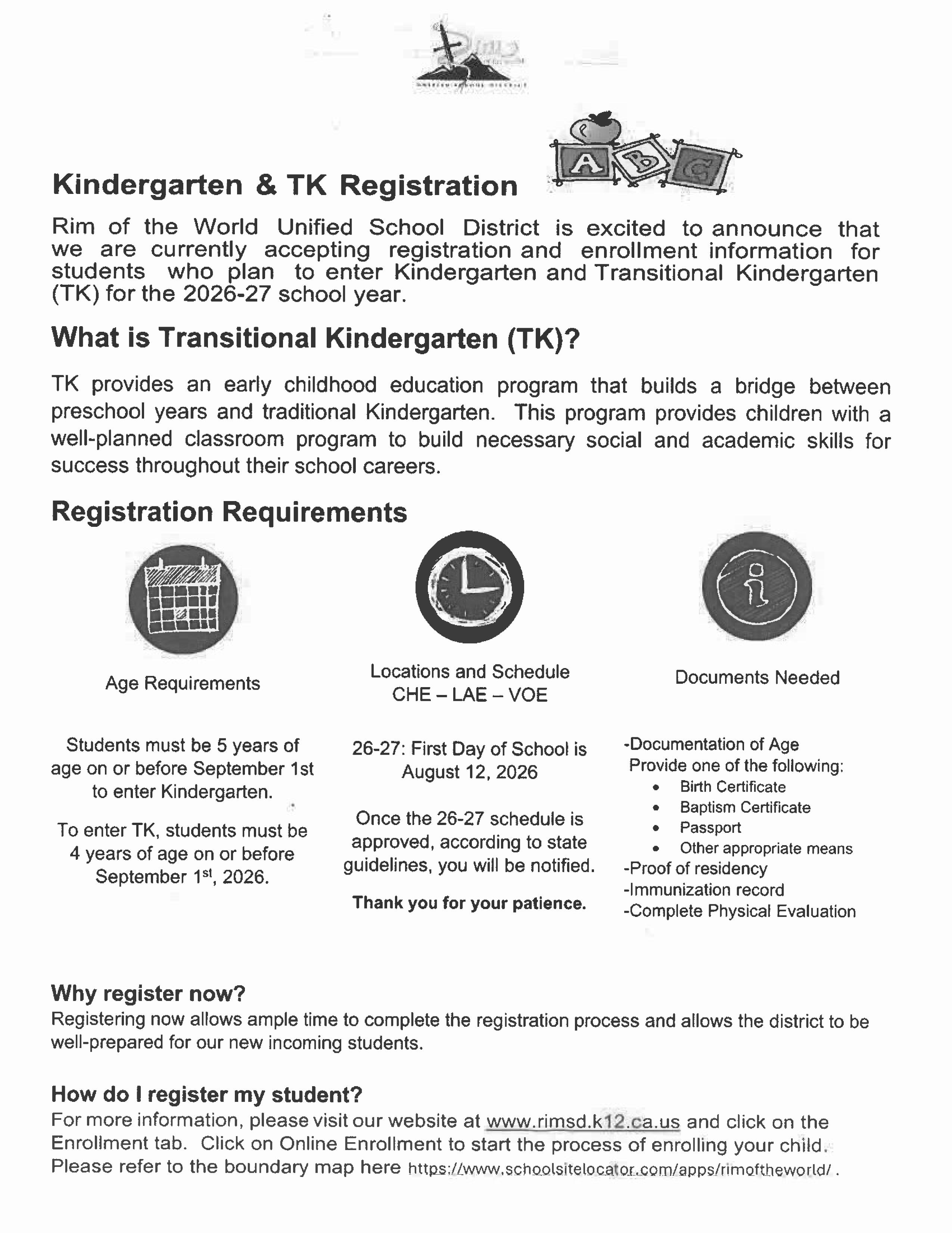 If you have a TK/Kindergarten-age child or know a new family to the area with children, please share the news. It's time to enroll. Students currently enrolled in a Rim of the World School do not need to re-enroll. Thank you!