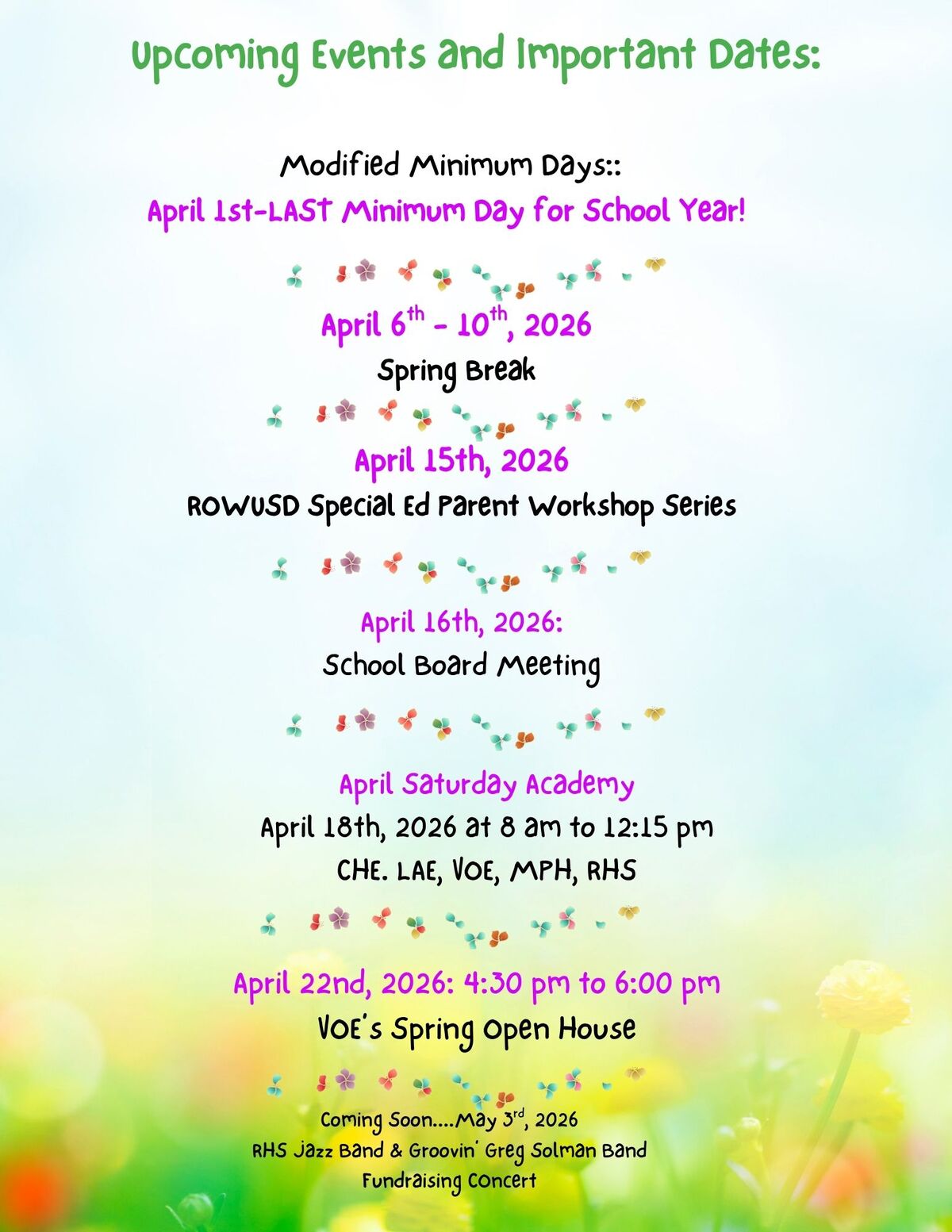 Page: Upcoming Events and Important Dates: Modified Minimum Days:: April 1st-LAST Minimum Day for School Year! April 6th - 10th, 2026 Spring Break. April 15th, 2026 ROWUSD Special Ed Parent Workshop Series. April 16th, 2026: School Board Meeting. April Saturday Academy April 18th, 2026 at 8 am to 12:15 pm CHE. LAE, VOE, MPH, RHS, April 22nd, 2026: 4:30 pm to 6:00 pm VOE’s Spring Open House, Coming Soon....May 3rd, 2026: RHS Jazz Band & Groovin’ Greg Solman Band