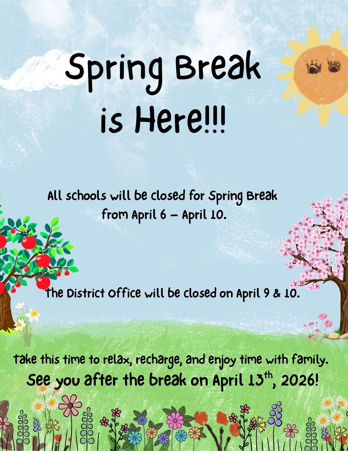 Page: Spring Break is Here!!! All schools will be closed for Spring Break from April 6 to April 10. The District Office will be closed on April 9 & 10. Take this time to relax, recharge, and enjoy time with family. See you after the break on April 13th, 2026!
