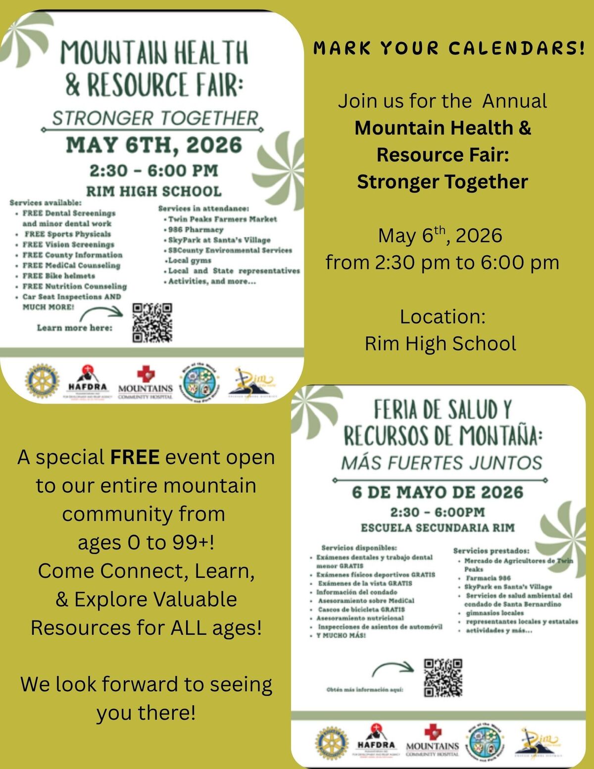 Page: Mountain Health & Resource Fair. Stronger Together. May 6th, 2026. from 2:30 pm to 6 pm at Rim High School. Services available: Free dental screenings, free sports physicals, free vision screenings, Free County information, Free MediCal counseling, Free Bike helmets, and much more. Services in attendance: Twin Peaks Farmers Market, 986 Pharmacy, Skypark at Santa's Village, SB Environmental Health Services, Local gyms, activities, and more.
