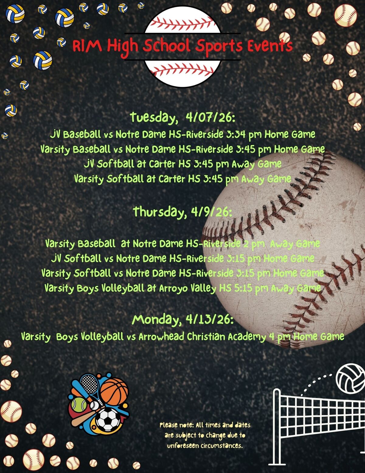 Page: RIM High School Sports Events. Tuesday, 4/07/26: JV Baseball vs Notre Dame HS-Riverside 3:34 pm Home Game, Varsity Baseball vs Notre Dame HS-Riverside 3:45 pm Home Game, JV Softball at Carter HS 3:45 pm Away Game, Varsity Softball at Carter HS 3:45 pm Away Game, Thursday, 4/9/26:, Varsity Baseball at Notre Dame HS-Riverside 2 pm Away Game, JV Softball vs Notre Dame HS-Riverside 3:15 pm Home Game, Varsity Softball vs Notre Dame HS-Riverside 3:15 pm Home Game