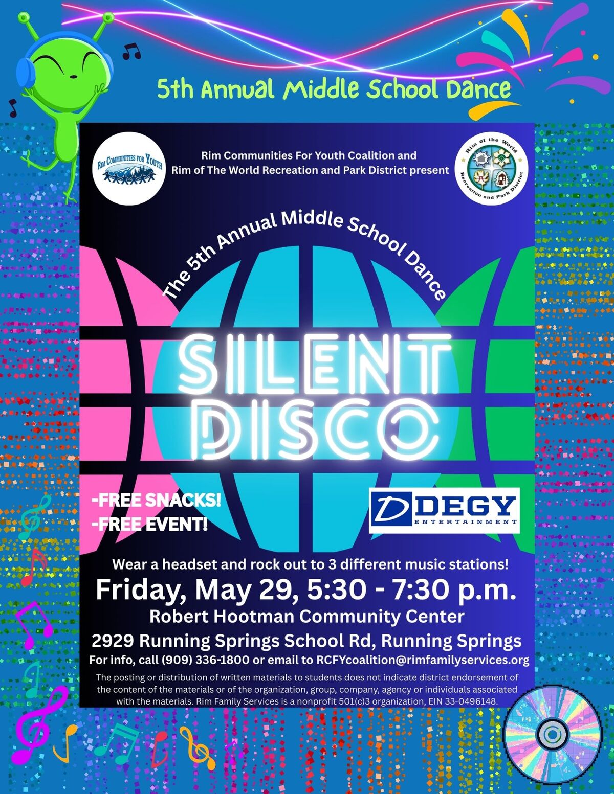 Page: 5th Annual Middle School Dance Rim Communities for Youth Coalition and Rim of the World Recreation and Park District present: The 5th Annual Middle School Dance-Silent Disco. Free Snacks and a Free Event. Presented by DEGY Entertainment. Wear a headset and rock out to 3 different music stations! Friday, May 29th, 5:30 to 7:30 pm. Robert Hootman Community Center. Location: 2929 Running Springs School Rd, Running Springs. For info, call (909) 336-1800 or email to RCFYcoalition@rimfamilyservices.orgPer ROWUSD School District: this posting, distribution, or written materials does not indicate district endorsement of the content of the materials or ot the organization, group, company, agency, or individuals associated with the materials.