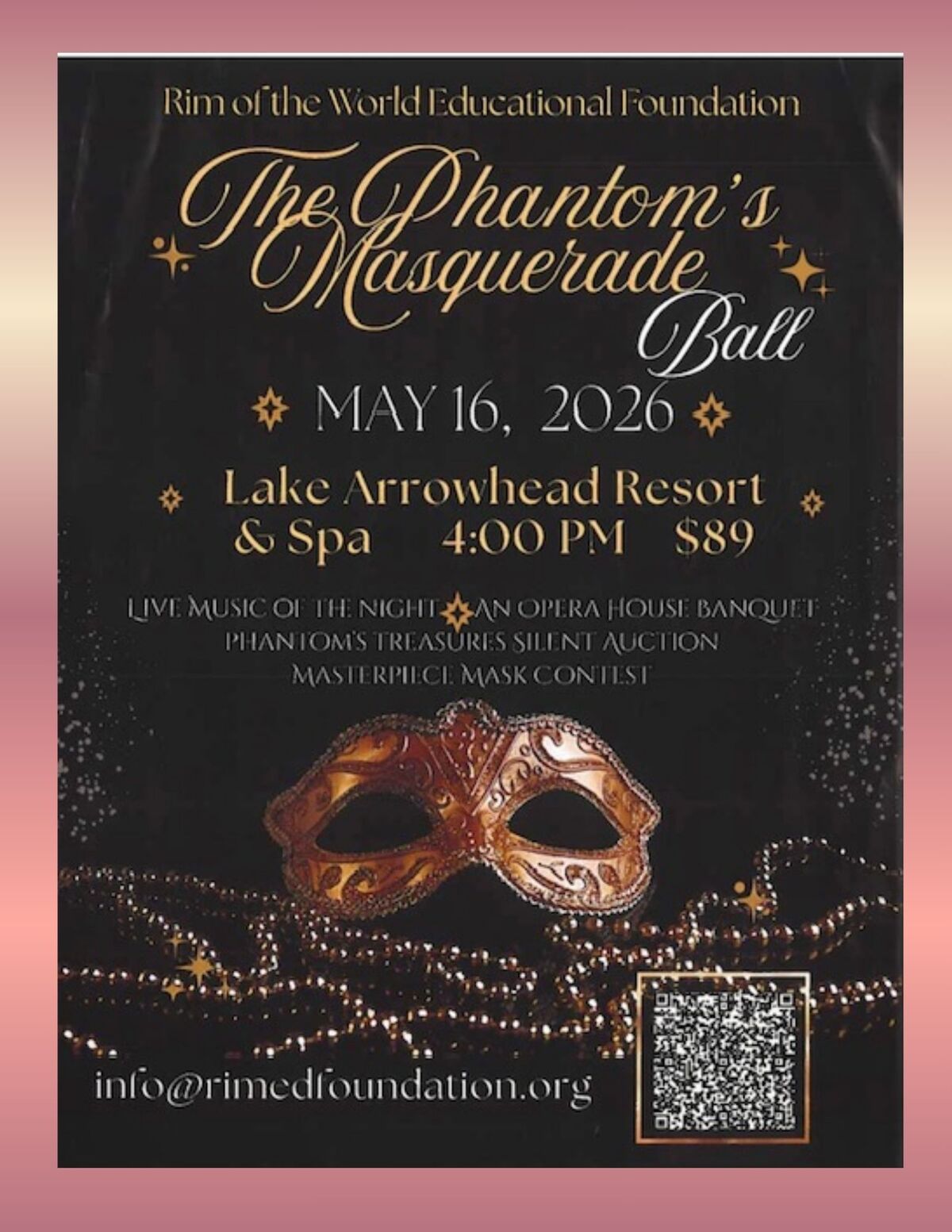 Page: Rim of the World Educational Foundation-The Phantom's Masquerade Ball. May 16th, 2026, at Lake Arrowhead Resort & Spa at 4 pm. Tickets $89. Live music of the night, an opera house banquet, Phantom's Treasure silent Auction, and Masquerade Contest. For more info: info@rimedfoundation.org ROWUSD School District: this posting, distribution, or written materials does not indicate district endorsement of the content of the materials or ot the organization, group, company, agency, or individuals associated with the materials.