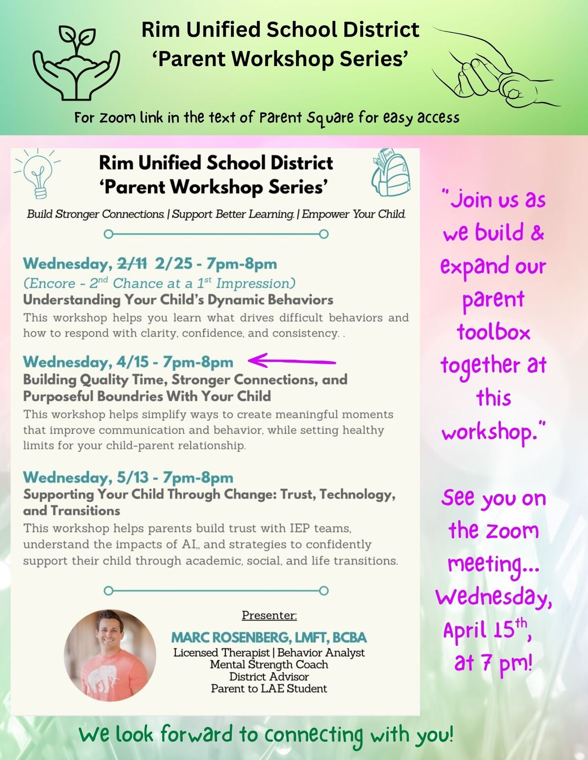 Page: Special Education “Parent Workshop Series” RIM Unified School District "Parent Workshop Series". Build Stronger Connections/Support Better Learning/Empower Your Child. Wednesday, 2/25 from 7 pm to 8 pm. (Encore 2 Chance at 1st Impression). Understanding Your Child's Dynamic Behaviors: This workshop helps you learn what drives difficult behaviors and how to respond with clarity, confidence, and consistency. Wednesday, 4/15, 2026, from 7 pm to 8 pm. Building Quality Time, Stronger Connections, and Purposeful Boundaries With Your Child: This workshop helps simplify ways to create meaningful moments that improve communication and behavior, while setting healthy limits for your child-parent relationship.Wednesday, 5/13, 2026, from 7 pm to 8 pm. Supporting Your Child Through Change: Trust, Technology, and Transitions: This workshop helps parents build trust with IEP teams, understand the impacts of AI, and strategies to confidently support their child through academic, social, and life transitions. Presenter: Marc Rosenberg, LMFT, BCBA, Licensed Therapist/Behavior Analyst, Mental Strength Coach, District Advisor, Parent to LAE Student.