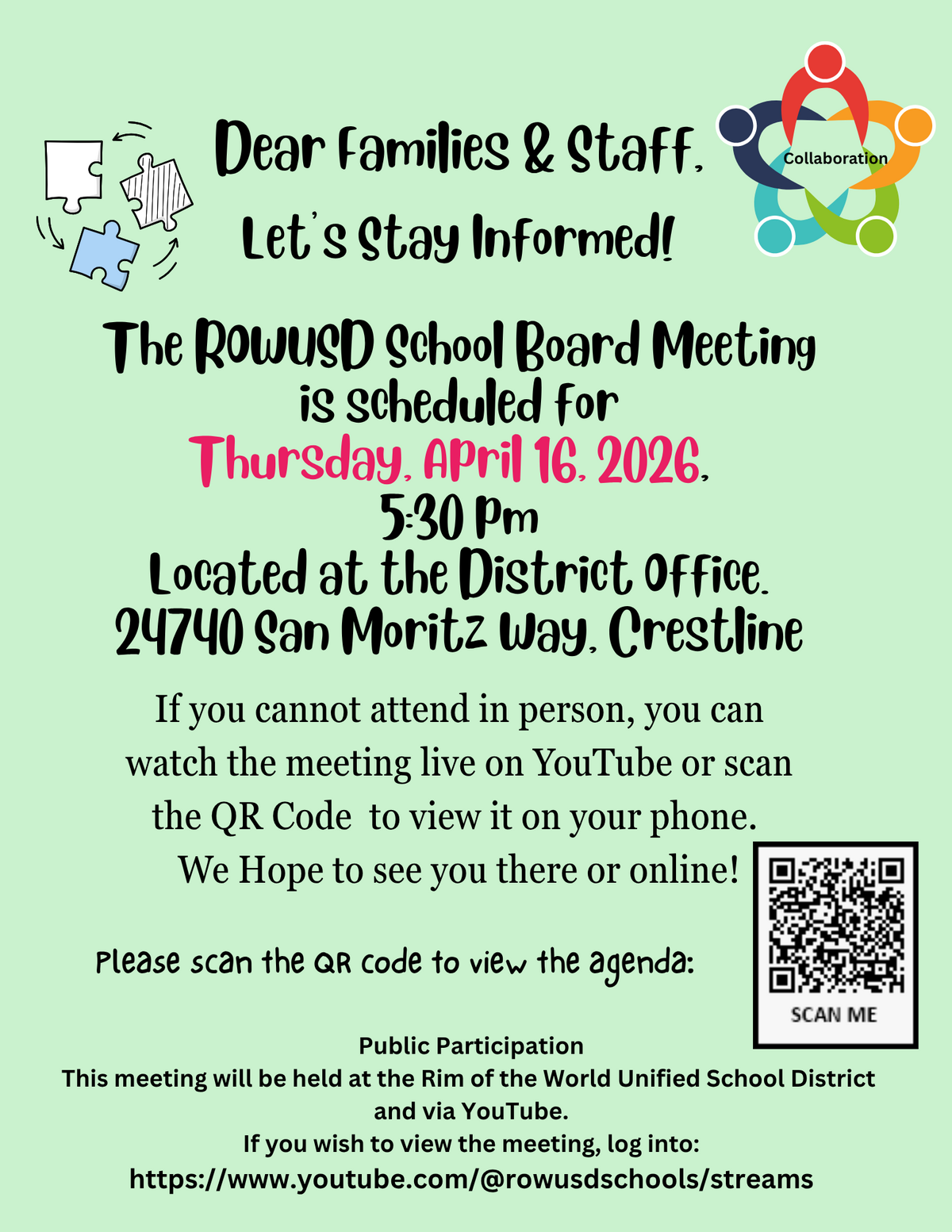 Page: Dear Families & Staff, Let’s Stay Informed! The ROWUSD School Board Meeting is scheduled for Thursday, April 16, 2026, at 5:30 pm, located at the District Office.24740 San Moritz Way, Crestline. If you cannot attend in person, you can watch the meeting live on YouTube or scan the QR Code to view it on your phone.