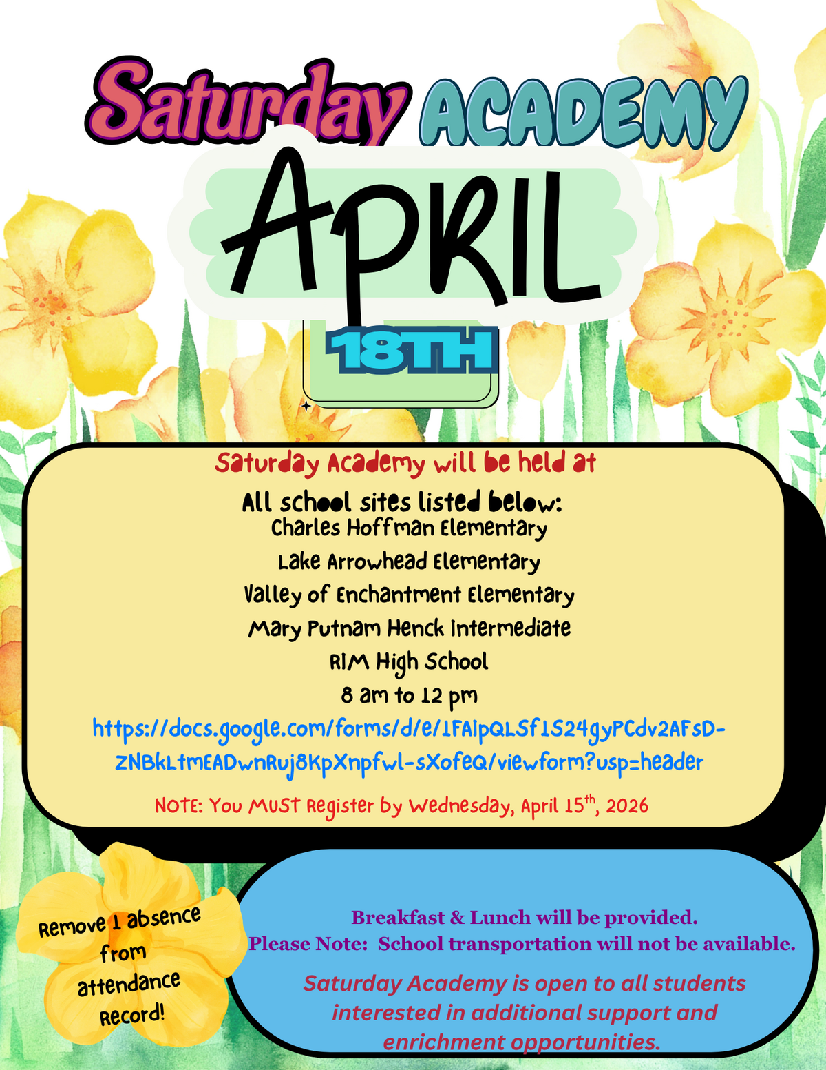 Page: Saturday Academy: April 18th: Charles Hoffman Elementary May 5th, 2026, at 2:00 - 3:00 pm, Lake Arrowhead Elementary