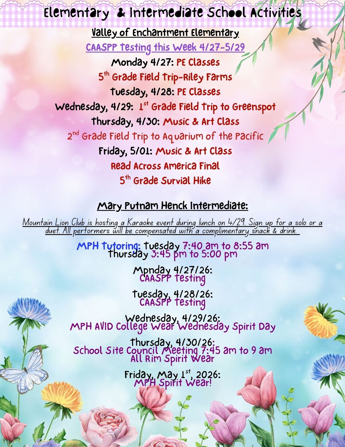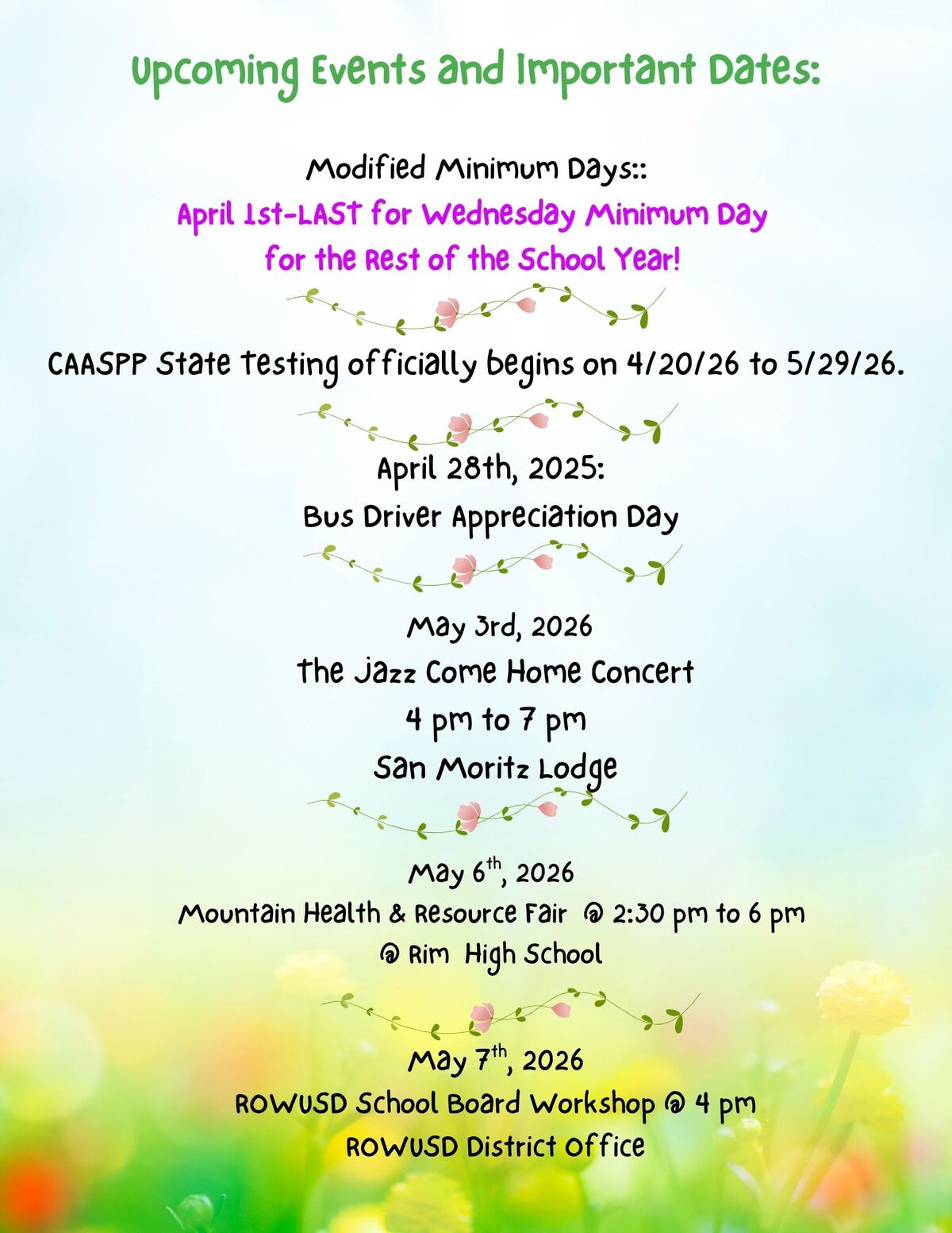 Page: Upcoming Events and Important Dates: Modified Minimum Days:: April 1st-LAST for Wednesday Minimum Day for the Rest of the School Year! CAASPP State Testing officially begins on 4/20/26 to 5/29/26. April 28th, 2025: Bus Driver Appreciation Day. May 3rd, 2026, The Jazz Come Home Concert, May 6th, 2026