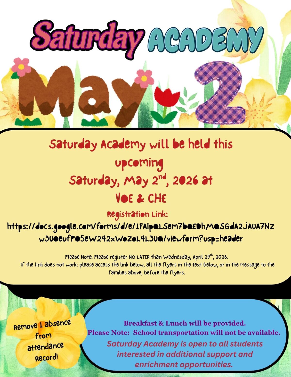 Page: Saturday Academy: May 2: will be held this upcoming Saturday, May 2nd, at VOE & CHE. Registration Link: https://docs.google.com/forms/d/e/1FAIpQLSem7bQEDhMQSGdA2JAUA7NZw3UOeufPO5eW242xWoZoL4L3UQ/viewform?usp=header