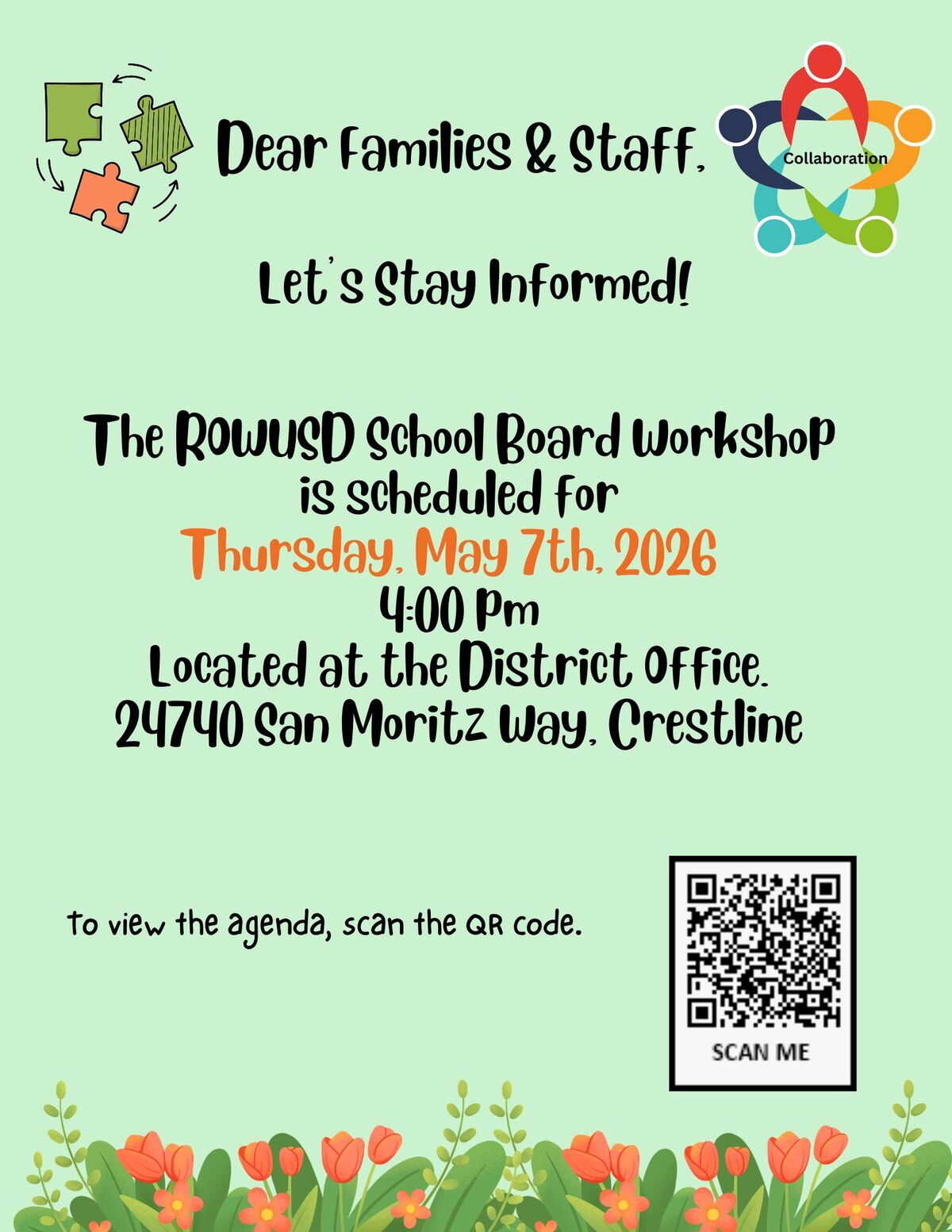 Mountain Health & Resource Fair  @ 2:30 pm to 6 pm@ Rim  High School, 4 pm to 7 pm @ San Moritz Lodge. May 7th, 2026 ROWUSD School Board Workshop @ 4 pm ROWUSD District Office
