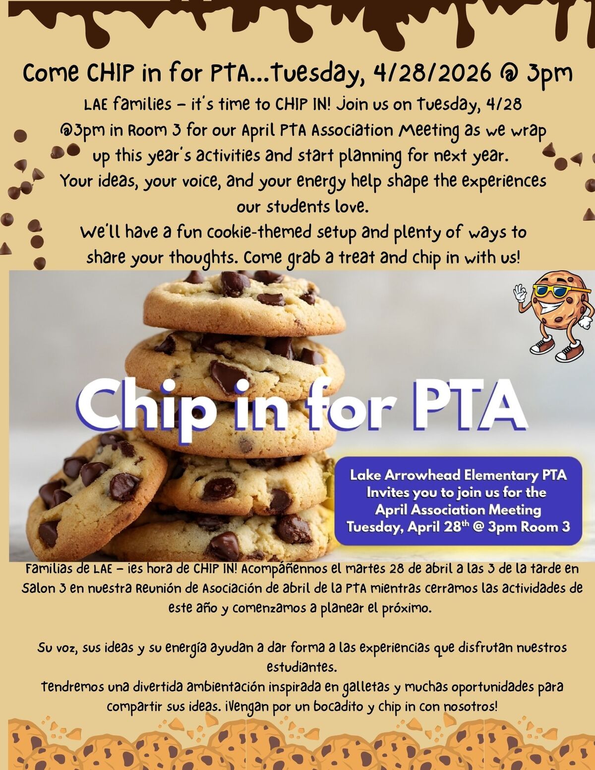 We’ll have a fun cookie‑themed setup and plenty of ways to share your thoughts. Come grab a treat and chip in with us! Chip in for PTA. Lake Arrowhead Elementary. Invites you to enjoy us for the April Association Meeting. Tuesday, April 28th 28th, @ 3pm in Room 3. Familias de LAE — ¡es hora de CHIP IN! Acompáñennos el martes 28 de abril a las 3 de la tarde en Salon 3 en nuestra Reunión de Asociación de abril de la PTA mientras cerramos las actividades de este año y comenzamos a planear el próximo.  Su voz, sus ideas y su energía ayudan a dar forma a las experiencias que disfrutan nuestros estudiantes.