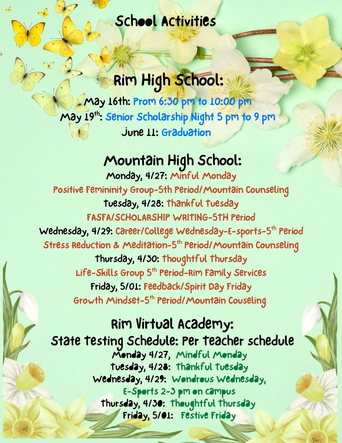 Page: School Activities. Rim High School:May 16th: Prom 6:30 pm to 10:00 pm, May 19th: Senior Scholarship Night 5 pm to 9 pm, June 11: Graduation. Mountain High School: Monday, 4/27: Minful Monday