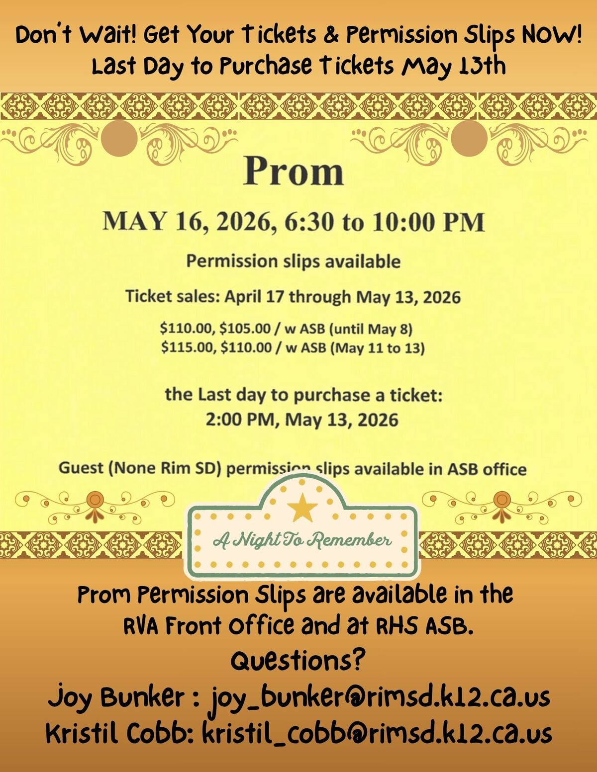 Page: Don’t Wait! Get Your Tickets & Permission Slips NOW! Last Day to Purchase Tickets May 13th.Prom on May 16, 2026, from 6:30  to 10 pm. Permission slips available. Ticket sales April 17th through May 13th, 2026. $110, $105/ w ASB (until May 8th) $115, $110/w ASB (May 11 to 13). The last day to purchase a ticket is at 2 pm on May 13th, 2026. Guest (None Rim SD) permission slips are available in the ASB office. Prom Permission Slips are available in the RVA Front Office and at RHS ASB. Questions?Joy Bunker : joy_bunker@rimsd.k12.ca.usKristil Cobb: kristil_cobb@rimsd.k12.ca.us