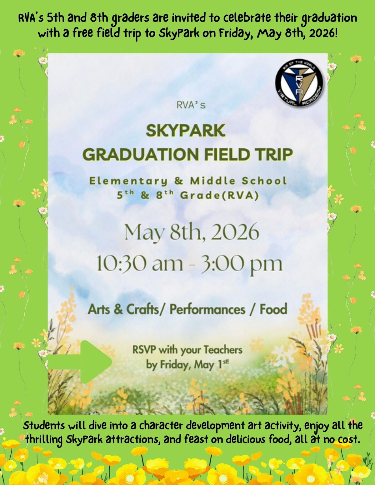 Page: RVA’s 5th and 8th graders are invited to celebrate their graduation with a free field trip to SkyPark on Friday, May 8th, 2026! RVA Skypark Field Trip. Elementary & Middle School 5th & 8th Graders (RVA) on May 8th, 2026, from 10 am to 3 pm. Arts & Crafts/Performances/Food. RSVP with your teachers by Friday, May 1st. Students will dive into a character development art activity, enjoy all the thrilling SkyPark attractions, and feast on delicious food, all at no cost.