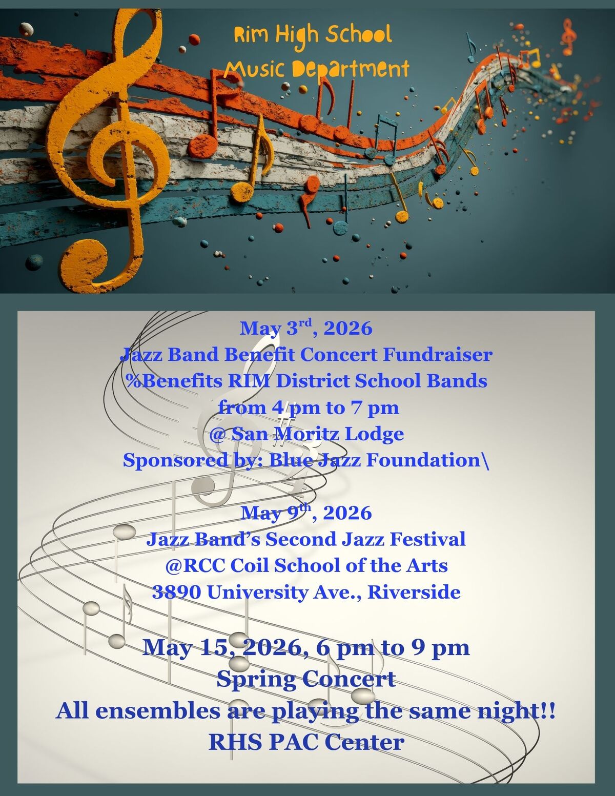 Page: May 3rd, 2026Jazz Band Benefit Concert Fundraiser%Benefits RIM District School Bands from 4 pm to 7 pm@ San Moritz LodgeSponsored by: Blue Jazz Foundation\May 9th, 2026Jazz Band’s Second Jazz Festival@RCC Coil School of the Arts3890 University Ave., Riverside