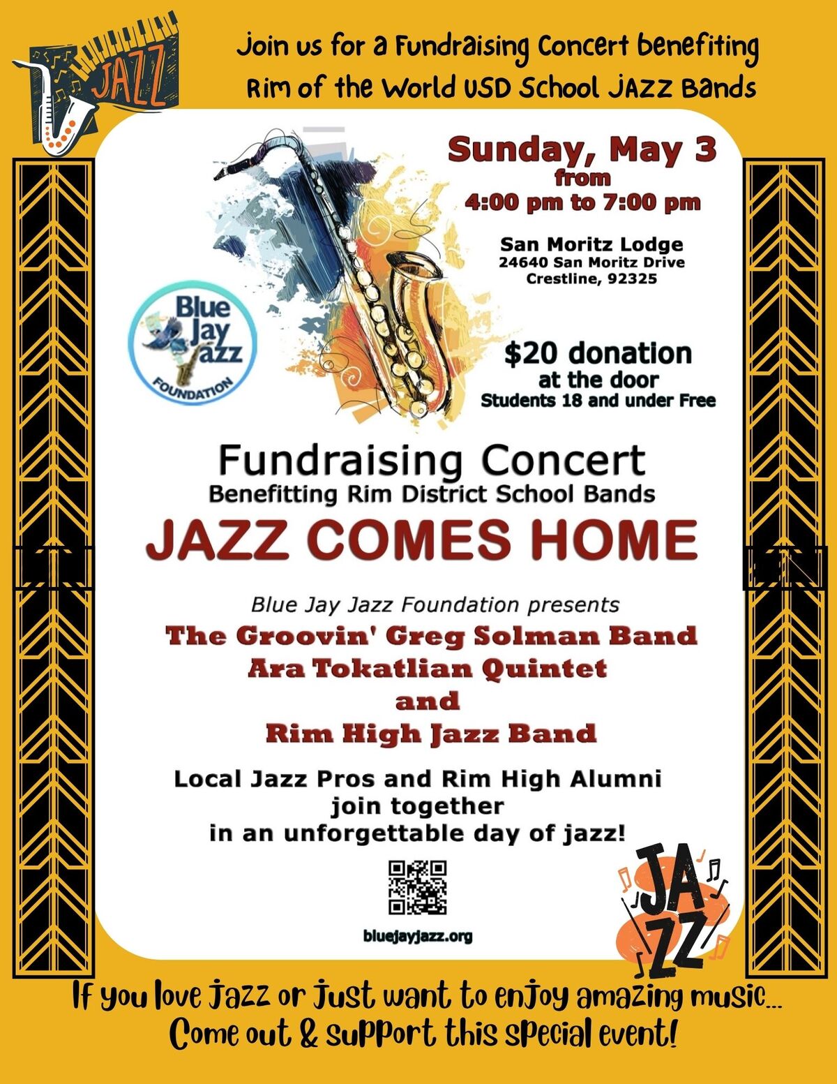 Page:  Join us for a JAZZ Fundraising Concert benefiting Rim of the World USD School Bands:  Sunday, May 3rd, 2026, from 4 pm to 7 pm. Located at San Moritz Lodge 24646 San Moritz Drive, Crestline, CA 92325. $20 donation at the door. Students under 18 and under are FREE. Fundraising Concert Benefitting Rim District School Bands Jazz Comes Home. Blue Jay Jazz Foundation Presents The Groovin' Greg Solman Band, Ara Tokatlian Quintet, and Rim High Jazz Band. Local Jazz Pros and Rim High Alumni join together in an unforgettable day of jazz.  If you love jazz or just want to enjoy amazing music...Come out & support this special event!