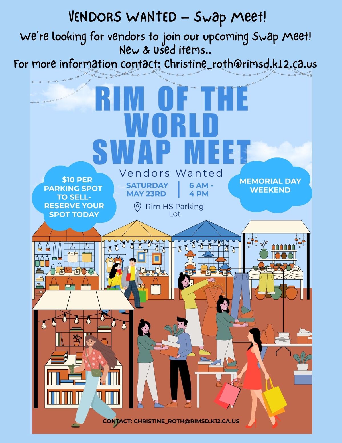 Page: VENDORS WANTED – Swap Meet! We’re looking for vendors to join our upcoming Swap Meet! New & Used items..For more information, contact: Christine_roth@rimsd.k12.ca.us Rim of the World Swap Meet Vendors Wanted. Saturday, May 23rd, from 6 am to 4 pm at the Rim HS Parking Lot. $10 per parking spot to sell-reserve your spot today. Memorial Day Weekend! We’re looking for vendors to join our upcoming Swap Meet!For more information, contact: Christine_roth@rimsd.k12.ca.us.