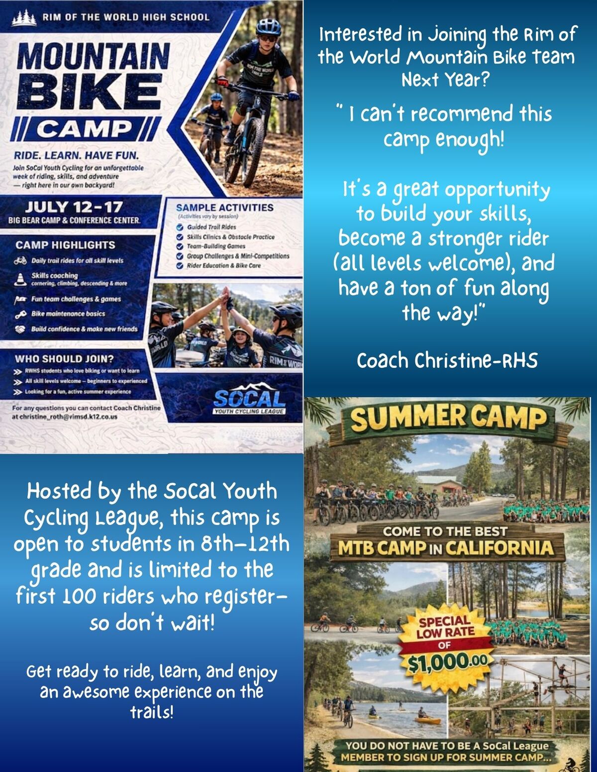 Page:  Interested in Joining the Rim of the World Mountain Bike Team Next Year? “ I can’t recommend this camp enough! It’s a great opportunity to build your skills, become a stronger rider (all levels welcome), and have a ton of fun along the way!” Coach Christine-RHS. Rim of the World High School Mountain Bike Camp. Ride, Learn, Have Fun. Join SoCal Youth Cycling for an unforgettable week of riding, skills, and adventure-right here in our own backyard. July 12-17th at the Big Bear Camp & Conference Center. Camp Highlights: Daily trail rides for all skill levels. Skills coaching: cornering, climbing, descending & more. Fun team challenges & games, Bike maintenance basics, and build confidence & make new friends! Who should join? RWHS students who love biking or want to learn. All skill levels welcome, beginners to experienced. Looking for a fun, active summer experience. Sample Activities (activities vary by session: guided trail rides, skills clinics & obstacle practice,  team-building games, group challenges & mini-competitions, & rider education & bike care. For any questions, you can contact Coach Christine at christine_roth@rimsd.k12.ca.usHosted by the SoCal Youth Cycling League, this camp is open to students in 8th–12th grade and is limited to the first 100 riders who register—so don’t wait! Summer Camp-Come to the Best MTB Camp in California. Special Low Rate of $1,000.00 You do not have to be a SoCal League Member to sign up for Summer Camp!