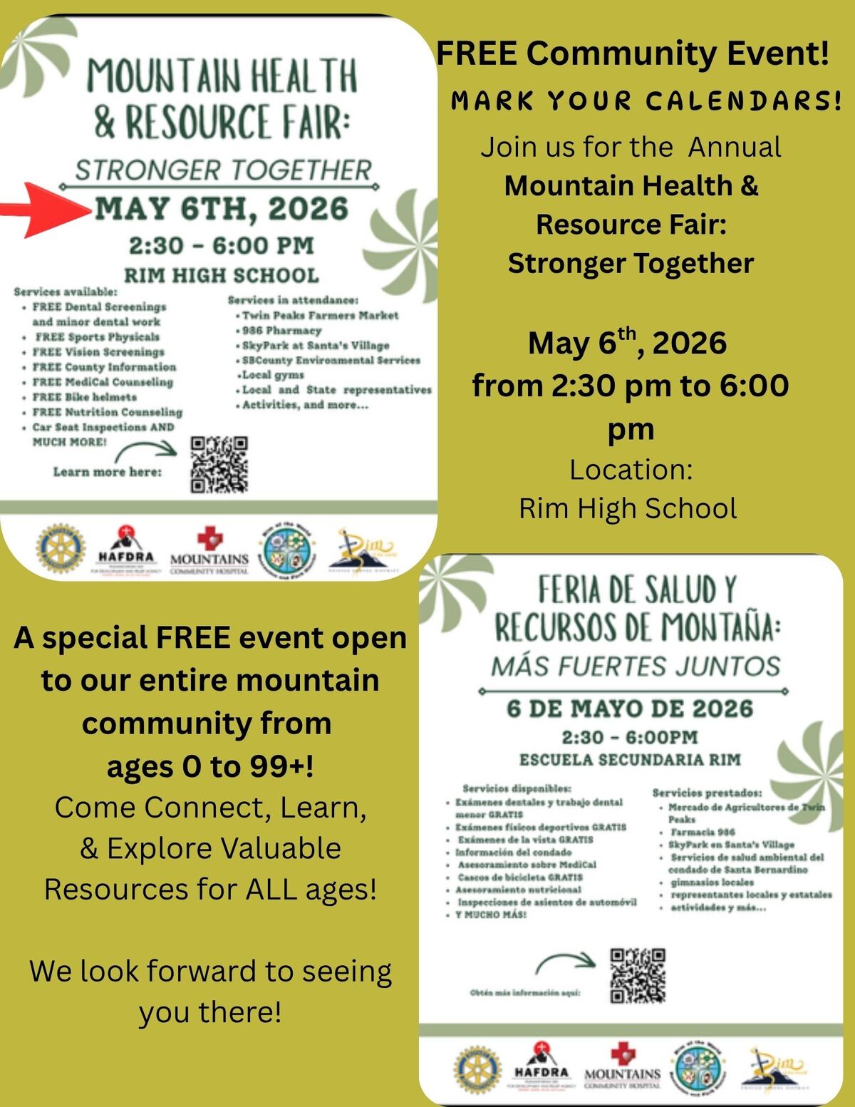 Page: Mountain Health & Resource Fair. Stronger Together. May 6th, 2026. from 2:30 pm to 6 pm at Rim High School. Services available: Free dental screenings and minor dental work, free sports physicals, free vision screenings, Free County information, Free MediCal counseling, Free Bike helmets, free nutrition counseling, car seat inspections, and much more.  Services in attendance: Twin Peaks Farmers Market,  986 Pharmacy, Skypark at Santa's Village, SB Environmental Health Services, Local gyms, activities, and more. Mark Your Calendars! Join us for the Annual Mountain Health & Resource Fair: Stronger Together, May 6th, 2026, from 2:30 pm to 6:00 pm, Location: Rim High School.