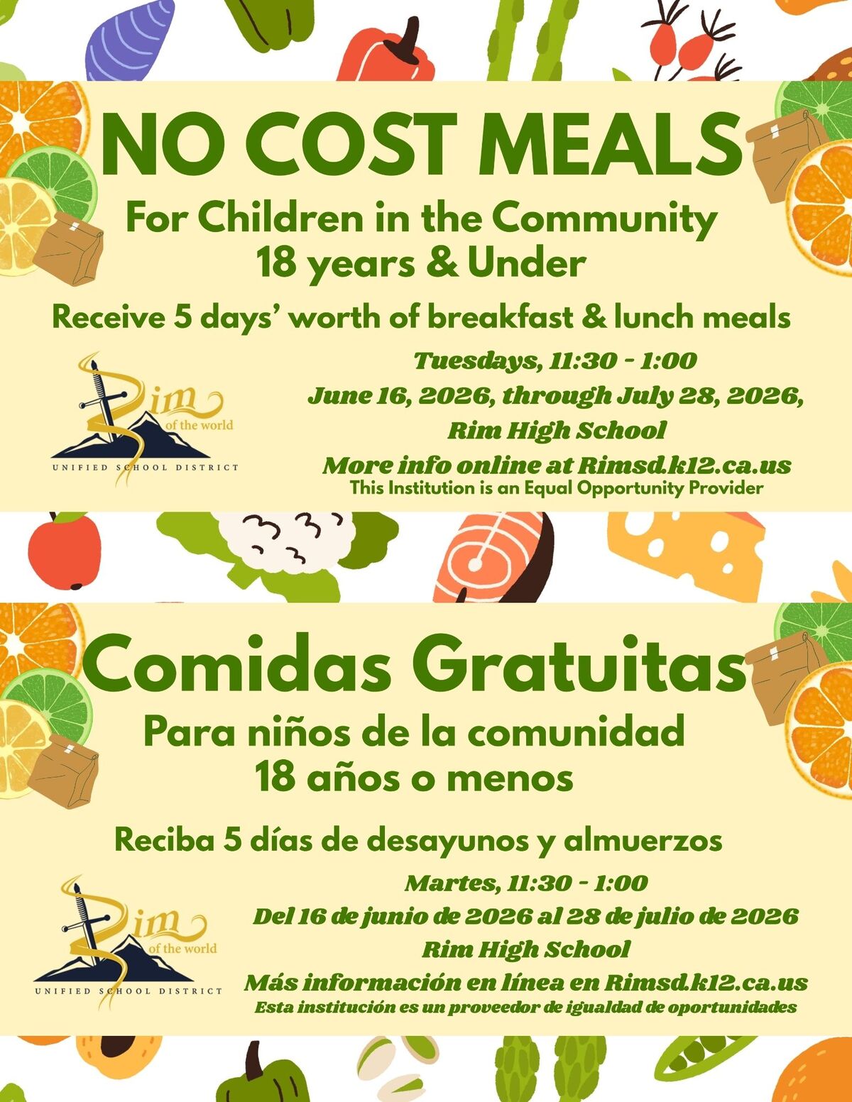 Page: Nutrition- Summer Meal Program Kicks Off June 16. Our Food Services Department would like to share an important update with our families: beginning June 16th, we will be launching our summer meal program to continue supporting student nutrition beyond the school year. We look forward to serving our community and ensuring students have access to healthy, delicious breakfast & lunch meals throughout the summer. No-cost meals for children in the community 18 years and under. Receive 5 days' worth of breakfast and lunch meals on Tuesdays, 11:30 to 1 pm, July 16th through July 28th, 2026, at Rim of the World High School.