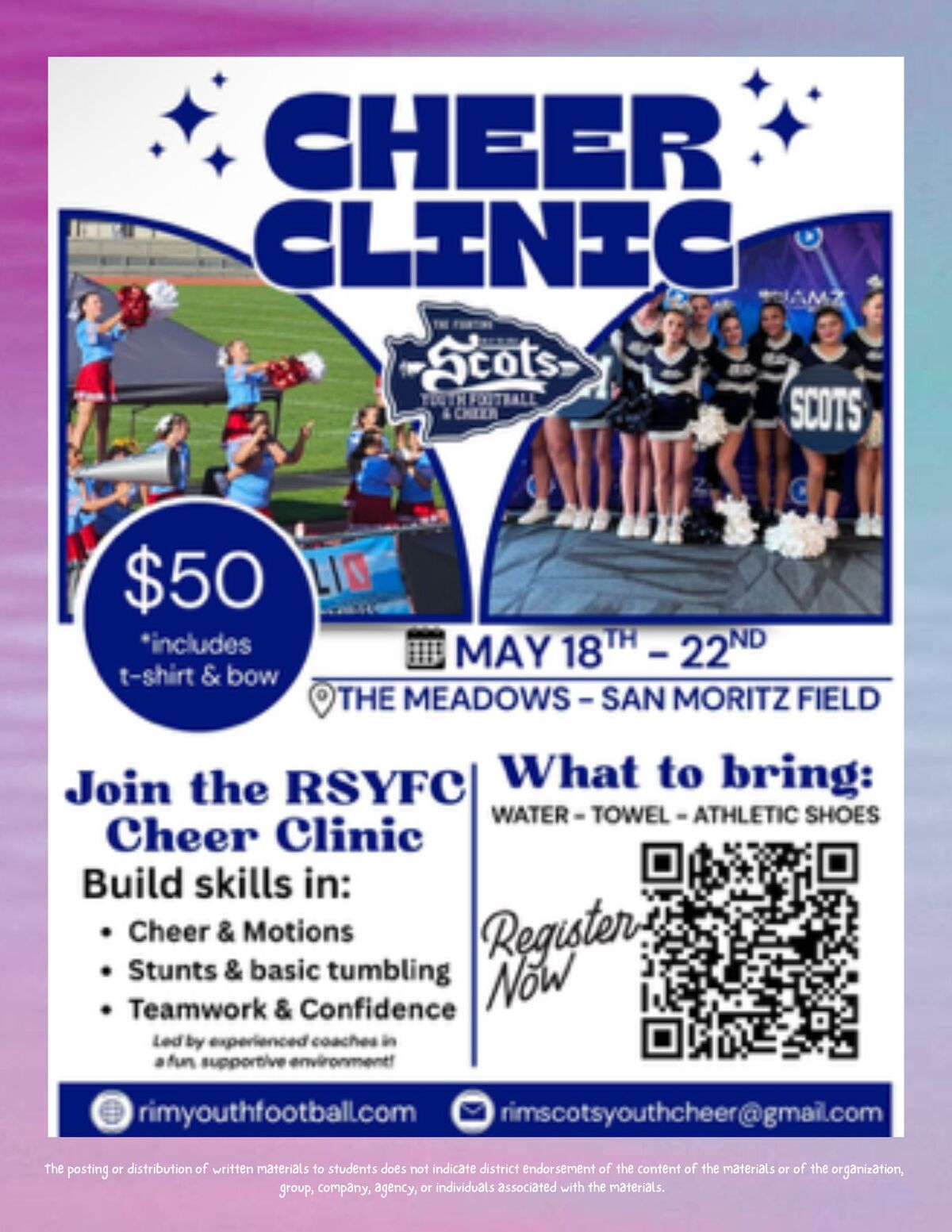 Page: Cheer Clinic-May 18th through 22nd, 2026. The Meadows-San Moritz Field. Join the RSYFC Cheer Clinic. Build skills in: Cheer & Motions,  Stunts & basic tumbling, & Teamwork & confidence. Led by experienced coaches in a fun and supportive environment.  What to bring: water, a towel, athletic shoes.  Register now. Rimyouthfootball.com or rimscotsyouthcherr@gmail.com