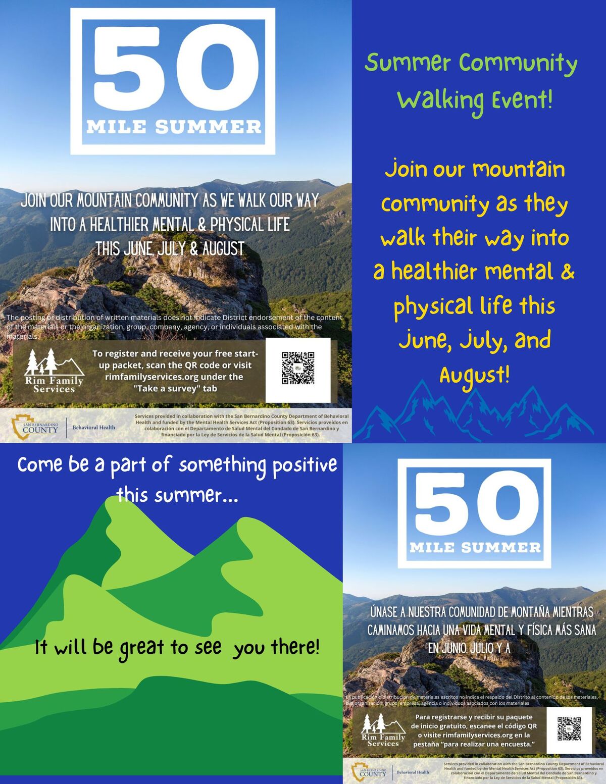 Page: 50 Mile:  Join our mountain community as they walk their way into a healthier mental & physical life this June, July, and August! Come be a part of something positive this summer...Join our mountain community as we walk our way into a healthier mental & physical life this June, July & August. To register and receive your free start-up packet, scan the QR code or visit rimfamilyservices.org under the Take the Survey tab. It will be great to see you there!