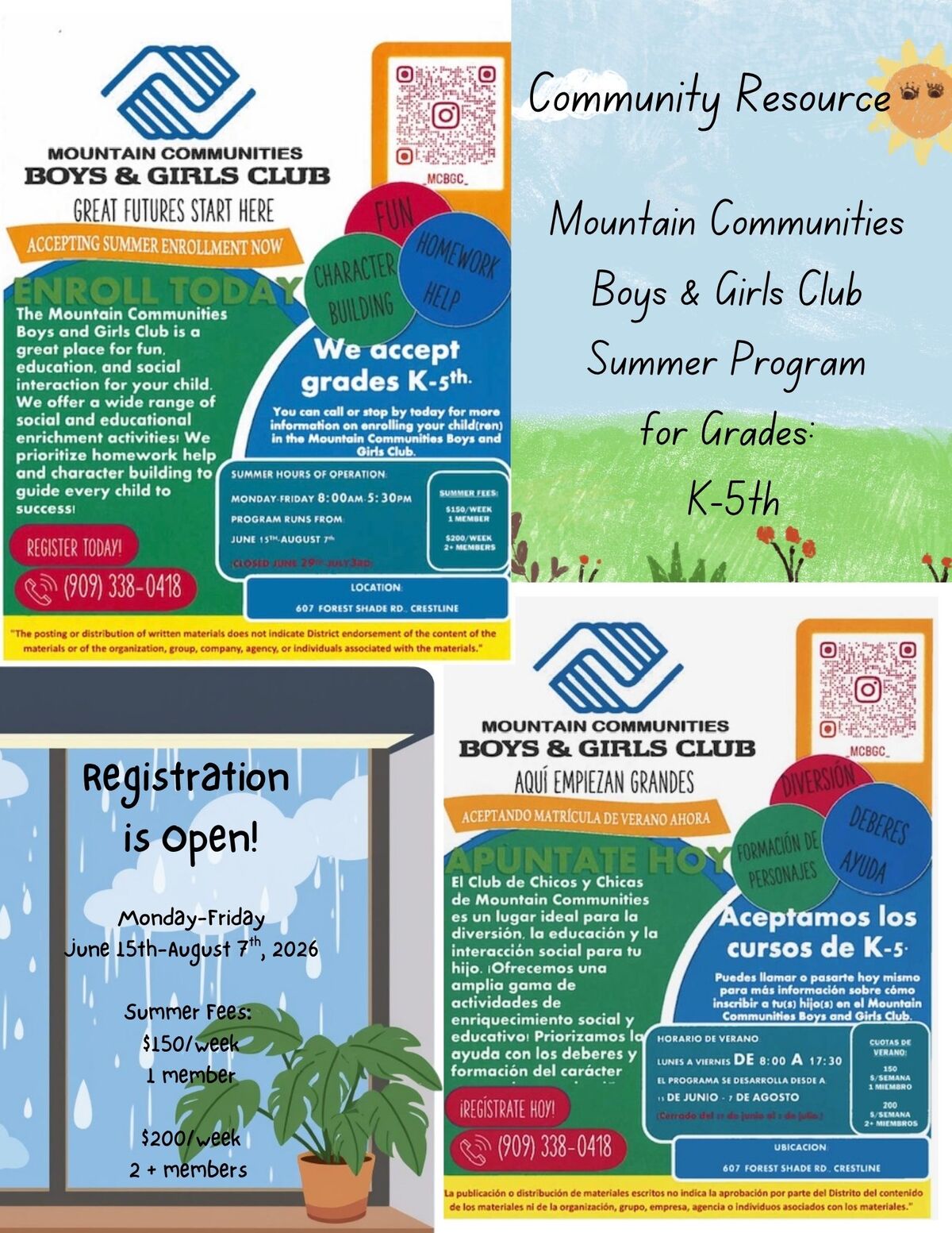 Page: Community Resource-Mountain Communities Boys & Girls Club Summer Program for Grades: K-5th. Registration